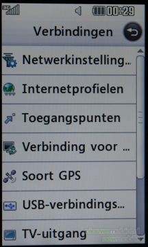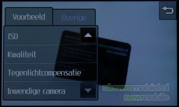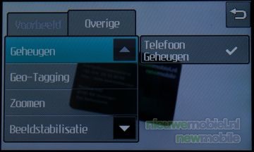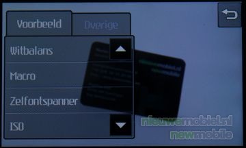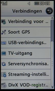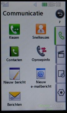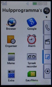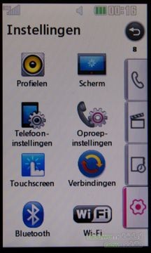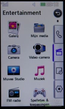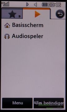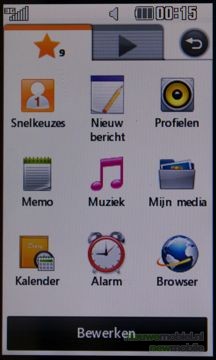 Het menu wordt bereikt door rechtsonder in het scherm te klikken op het icoontje wat nog het meest wegheeft van een blauwe dobbelsteen met 4 ogen. Het menu is weinig verassend maar wel duidelijk en mooi vormgegeven en bovenal handig in gebruik. Behalve de favorieten, die bereikbaar zijn via de middelste knop aan de voorkant van het toestel, is er niets aan te passen aan het menu.