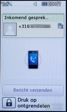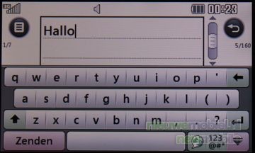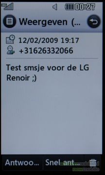 De LG KC910 Renoir kan echter meer. Door linksboven op het scherm te klikken verschijnt een aantal opties om een bericht op een andere dan de standaardmanier in te voeren. Zo kan bijvoorbeeld gekozen worden voor een Qwerty-toetsenbord. Het scherm draait hiervoor een kwartslag zodat op een scherm horizontaal een heus computer-toetsenbord verschijnt waarmee de letters één voor één kunnen worden aangewezen met de vinger of de stylus. Deze manier voor het opstellen van een bericht is naast leuk, omdat het weer eens wat anders is, ook erg snel doordat er bovenin het scherm suggesties komen te staan uit het woordenboek voor woorden die ingetypt worden. Dit gebeurt nadat er twee of meer letters door de gebruiker zijn aangeklikt: is bijvoorbeeld al ha ingetypt dan komt bovenin het scherm hallo, haven halen etc. te staan. De woorden worden steeds aangepast naarmate er meer letters door de gebruiker worden toegevoegd. Een soort T9, maar dan met verschillende woorden helemaal uitgeschreven. Als het juiste woord ertussen staat, klik je daar op en het verschijnt in het berichtenscherm.