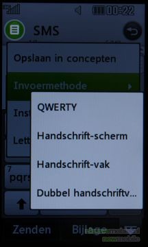Misschien wel de leukste manier om berichten in te voeren is volgens de zogenaamde methode van het ‘handschriftvak’. Dit vergt wel de nodige precisie maar oefening baart kunst. Met de stylus wordt een woord op het scherm geschreven binnen het handschriftvak en het toestel zet dit handschrift automatisch om in woorden voor in een bericht. Zelf bij heel netjes schrijven maakt het toestel hier wel foutjes mee. Heel snel gaat het niet maar het is wel heel leuk.