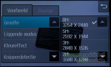 Wanneer gekozen wordt voor ‘modus’ in het menu van de camera verschijnt een groot aantal mogelijkheden. Zo is er de modus ‘normaal’, daar is niets bijzonders aan; er wordt een foto van goede kwaliteit gemaakt. Leuk zijn de ‘glimlachfoto’, waarbij de foto pas wordt gemaakt op het moment dat een persoon glimlacht en het maken van een ‘kunstfoto’, waarbij gekozen kan worden uit de stijlen warm, origineel, koud of zwart-wit. Nog leuker zelfs is de modus waarin een reeksopname wordt gemaakt: in zeer korte tijd worden dan een groot aantal foto’s achter elkaar gemaakt. De meest bijzonder modus is die waarin een ‘verfraaide foto’ wordt gemaakt; personen die op de foto worden gezet krijgen in deze modus automatisch een mooi egale huid, alle oneffenheden zijn weggewerkt. Verder kan nog worden gekozen voor de modus waarbij een panoramafoto wordt gemaakt of er een lijst om een opname wordt geplaatst. Eigenlijk beschikt de camera over te veel cameraopties om ze hier allemaal te kunnen noemen. De belangrijkste zijn toch wel dat het formaat van de foto gewijzigd kan worden (320x 240, 640 x 480, 2048x 1538 of 2592 x 1944), rode ogen weggewerkt kunnen worden, foto’s zelfs tegen het licht in genomen kunnen worden en dat de kleur van de foto gewijzigd kan worden. Ook beschikt het toetstel over de optie ‘morphing’, waarbij de afbeelding aan de hand van een smiley wordt aangepast. Keuze genoeg aan smileys: van boos tot heel blij. Dit heeft het effect van een lachspiegel.