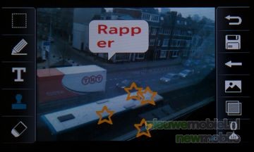 In een apart menu voor het bewerken van foto’s zijn nog meer opties om foto’s ‘op te leuken’. Zo kan er een stempel op de foto gezet worden, bijvoorbeeld in de vorm van een hartje of bloemetje en kan er een tekstballon in de foto worden gezet met een getypt stukje tekst erin. Last but not least kan met de stylus op een foto worden geschreven, waarbij de handgeschreven tekst op de foto blijft staan. Dit levert veel lol op.