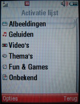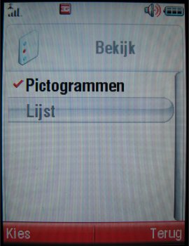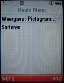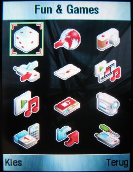 Het echte menu, dat bestaat uit 3 x 4 geanimeerde iconen, spreekt voor zich en kan benaderd worden door op de optietoets of de middelste richtingtoets te drukken. Men kan gebruik maken van drie verschillende thema's voor het menu. Helaas is het niet mogelijk menuthema's te downloaden, wel kan men bij elkaar passende achtergronden, beltonen en screensavers downloaden en samenstellen tot een thema. Echt mooie menuthema's waarvan Nokia en Sony Ericsson toestellen gebruik maken is hier dus niet mogelijk.