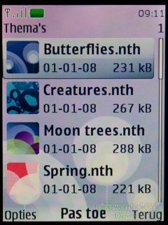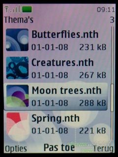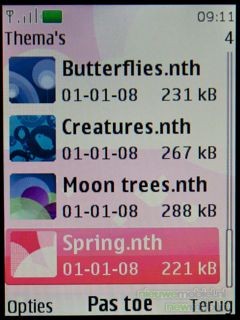Standaard kent het toestel vier thema’s om het scherm mee op te vrolijken: Butterflies, Creatures, Moon trees en Spring. Via Nokia.com kunnen andere thema’s gedownload worden en aan de telefoon worden toegevoegd. Als achtergrond van het beeldscherm kan ook gekozen worden voor een diareeks van een map uit de galerij zoals zelfgemaakte foto’s.