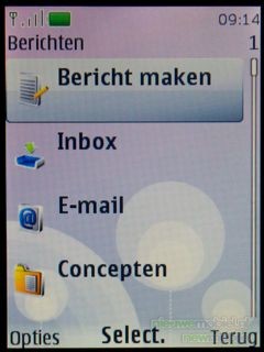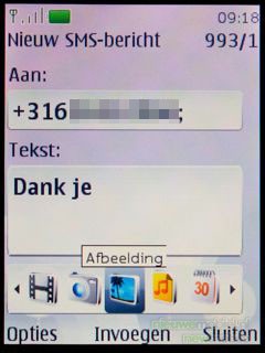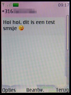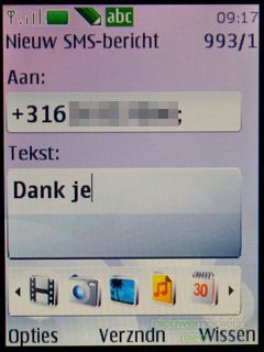 Voor het opstellen van een ‘gewoon’ bericht wordt gekozen voor de optie ‘bericht’. Vervolgens verschijnt er een scherm waarin, net als bij het opstellen van een e-mailbericht op de computer, eerst de ontvanger wordt ingevoerd en daarna in hetzelfde scherm het bericht wordt getypt. Hiervoor kan het woordenboek (T9) in – en uitgeschakeld worden. T9 bevindt zich onder de aparte naam ‘voorspellingsopties’ in het menu met opties van een nieuw SMS-bericht. Hoe gek de naam ook klinkt, T9 werkt ook bij dit toestel even simpel als gewoonlijk; het toevoegen van woorden aan het woordenboek is ook en fluitje van een cent. Het is ook mogelijk om smileys in het bericht te plaatsen; in het geheugen van de telefoon is een scala aan smileys toegevoegd waarvan er op elk moment wel één is die de juiste uitdrukking bevat.