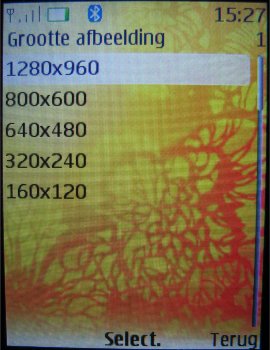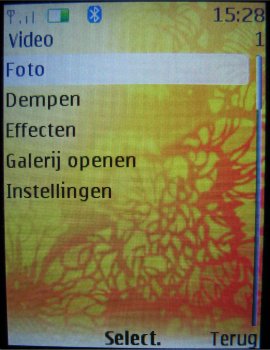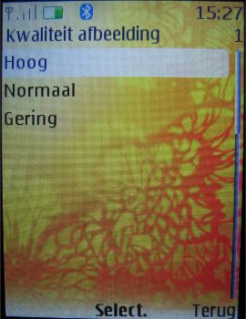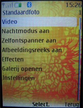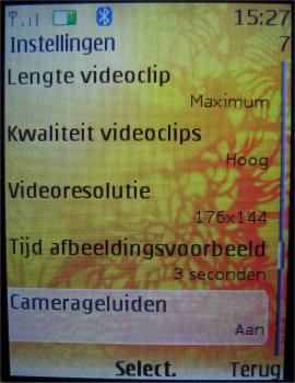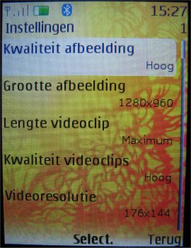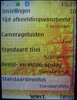 De opties die de camera heeft zijn gelijk aan de videocamera met de kanttekening dat het geluid tijdens het opnemen uitgeschakeld kan worden en dat er alleen bij de standaard camera voor een afbeeldingsreeks, zelfontspanner of nachtmodus gekozen kan worden. De andere opties zijn diverse resoluties (1280 x 960, 800 x 600, 640 x 480, 320 x 240, 160 x 120 pixels), de kwaliteit van de afbeelding (Hoog, normaal, gering), de lengte van de videoclip (Standaard en maximum), de kwaliteit van de video (Hoog, normaal en laag), de resolutie van de videocamera (176 x 144 en 128 x 96 pixels), de standaardinstelling voor de titel, het al dan niet inschakelen van de camerageluiden en de modus die als eerste opgestart zal worden (Camera of video).