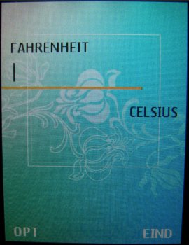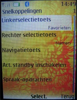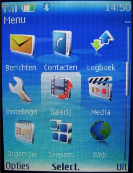 Via dit homescreen kan men onderdelen in het menu openen en maar het is ook mogelijk zelf via de centrale toets het menu te openen. In een raster van 3 x 3 iconen wordt het uiteindelijke menu getoond.