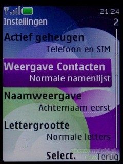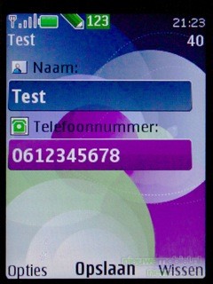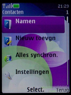 Contacten kunnen eenvoudig opgeslagen worden in de telefoon door in het menu op ‘contacten’ en vervolgens op ‘nieuw toevoegen’ te klikken. Naast de achter-en voornaam en het mobiele nummer van de contactpersoon kunnen standaard het thuisnummer, e-mailadres en een afbeelding worden toegevoegd. Daarnaast kan nog andere informatie toegevoegd worden zoals een video, toon, webadres, bedrijf, functie, officiële naam, bijnaam, postadres, gebruikers-ID, verjaardag en een notitie. Contacten kunnen weergegeven worden in een namenlijst, met naam en nummer of naam en afbeelding. Aan het aantal contactpersonen dat opgeslagen kan worden zit een maximum, maar dit maximum wordt niet weergegeven in aantal maar in procenten (hoeveel procent van het geheugen heb je al verbruikt, en hoeveel procent is er nog vrij). Het maximum contactpersonen dat opgeslagen kan worden is afhankelijk van de hoeveelheid informatie die wordt toegevoegd per contactpersoon. Personen kunnen ingedeeld worden in groepen.