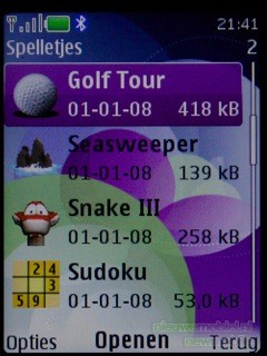 De telefoon kent standaard de spelletjes: Golf tour, Sudoku, Seasweeper en Snake III. Bij het spelletje Golf Tour kan gekozen worden uit verschillende landschappen (Golfresort Foutloze Fairways of Golfclub Boszicht) en er kan gekozen worden uit de volledige baan, eerste negen, laatste negen of een oefenhole. Daarnaast kan gekozen worden uit 1 t/m 4 spelers.