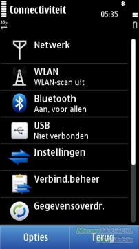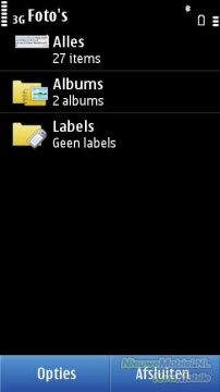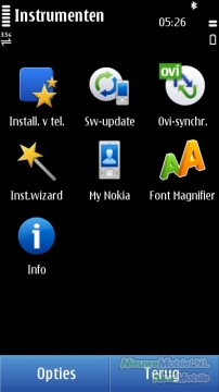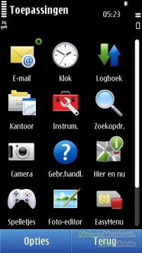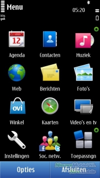 De menuknop onder het scherm opent het hoofdmenu van Symbian. Hier worden alle functies nog eens weergegeven. Er worden twaalf symbolen weergegeven in een raster. Het icoontje van de OVI-winkel valt meteen op. Hier kun je allerlei games, ringtones en andere extra’s voor je telefoon kopen. Hoewel het menu er op zich gestroomlijnd uitziet, is de indeling niet erg praktisch. Sommige onderdelen zitten erg ver weggestopt: om bij de notities te komen ga je eerst naar het hoofdmenu, dan naar ‘toepassingen’, en vervolgens naar ‘kantoor’. Hierdoor kan het soms veel tijd in beslag nemen om iets op te zoeken. Ook het logboek staat onder het nogal vage submenu ‘toepassingen’. De overzichtelijkheid laat dus te wensen over.