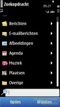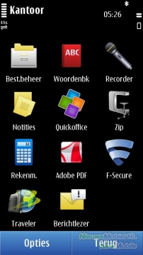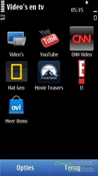 Opvallend is het submenu ‘Video’s en tv’. Hier zijn links naar YouTube, CNN Video en E! ondergebracht. Daarnaast vinden we ‘instellingen’ en ‘sociale netwerken’. Onder dit laatste menu kunnen alle sociale netwerken via OVI bereikt worden. Onder ‘toepassingen’ vinden we e-mail, de klok, het logboek, instrumenten, camera, en nog meer toepassingen. Hier staat ook het kopje ‘kantoor’: via dit icoontje kom je bij bestandenbeheer, het woordenboek, voice- recorder, notities, Quickoffice, Zip, rekenmachine, Adobe Pdf, F-secure en World Traveler. Daarnaast biedt het menu ‘toepassingen’ een (omzichtige) manier om de camera te bereiken, evenals spelletjes en de foto-editor.