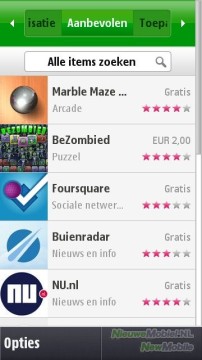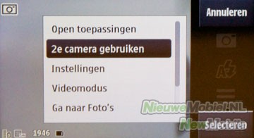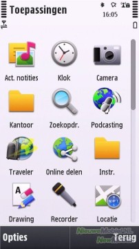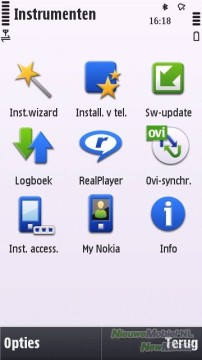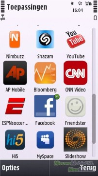 De menuknop (onder het touchscreen) opent het hoofdmenu van het Symbian-besturingssysteem. Het hoofdmenu bestaat uit een grid met 4 x 3 iconen. Opvallend is het icoontje naar de OVI-winkel. Deze snelkoppeling betreft de online Nokia-winkel waar je allerlei producten (ringtones, games etc.) en applicaties kunt kopen en/of downloaden.