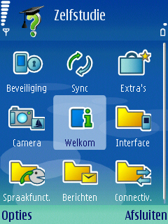 De zelfstudie applicatie is iets wat sindskort pas op de toestellen van Nokia aanwezig is. De applicatie legt alle functies uit van het toestel in een redelijk aantal aparte programma’s. Alle functies van het toestel komen aanbod en geven de gebruiker een goed beeld van het toestel. Standaard wordt dit programma bij de eerste keer opstarten opgeroepen waardoor iedereen gelijk door de complete uitleg kan lopen.