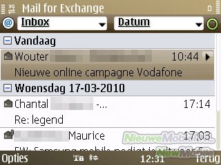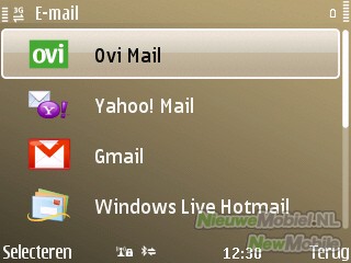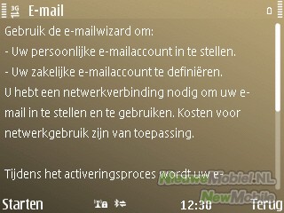 E-mailaccounts kunnen eenvoudig ingesteld worden met de wizard. Hierbij kan gekozen worden uit Ovi Mail, Yahoo! Mail, Gmail, Hotmail, Ziggo, Mail for Exchange, Lotus Notes Traveler of een andere. Vervolgens is het een kwestie van de gegevens invullen en er verschijnt een snelkoppeling naar de mailbox in het startscherm. Voor synchronisatie kan een interval ingesteld worden variërend van 10 minuten tot handmatig en push. Met bijlages kan de E72 prima overweg. Voor HTML-berichten start de E72 een browserscherm.