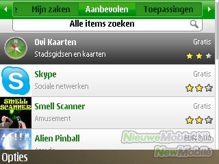 Voor verdere uitbreiding van de functionaliteit is er de Ovi Store. De store is behoorlijk overzichtelijk met verschillende categorieën en schermafbeeldingen bij de beschrijving van applicaties. Het aanbod is nog wat beperkt en het gemiddelde prijsniveau ligt ook wat hoger dan bij de Android Market en de App store van Apple. Betalen kan via je telefoonrekening of met creditcard.