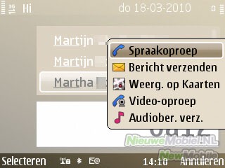 Een contactpersoon vinden gaat erg makkelijk door gewoon in het startscherm de naam van de persoon in te typen. Vervolgens kan de persoon meteen gebeld worden door op de beltoets te drukken of er kan een menu geopend worden door met de navigatietoets naar rechts te klikken. Hier kan dan gekozen worden uit bijvoorbeeld spraakoproep, bericht of e-mail verzenden.