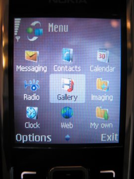 Wanneer de afbeeldingen gemaakt zijn door de camera kunnen ze opgevraagd worden via de Galerij icoon in het menu. Hier wordt geen scheiding meer gemaakt tussen de data op de geheugenkaart en de data op de telefoon zelf zoals dat bekend is uit vorige Series 60 modellen. Onder de map afbeelding vindt men de gemaakte afbeeldingen in een nieuwe weergave in een soort rondo. Dit is de enige weergave die mogelijk is. Het laden van de foto duurt redelijk lang wanneer een grote hoeveelheid foto’s geladen dient te worden. De traagheid van de Galerij is af en toe irritant wanneer even snel een foto getoond moet worden.