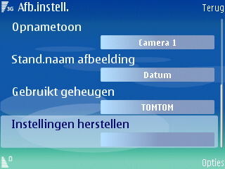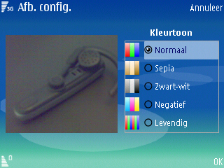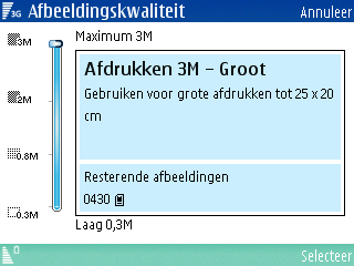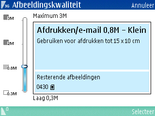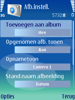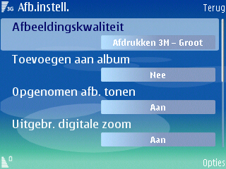 Verdere instellingen die in het toestel aanwezig zijn voor de camera is de fotokwaliteit gerelateerd aan resoluties (2048 x 1536), (1600 x 1200), (1024 x 768), (640 x 480), het inschakelen van digitale zoom, de keuze uit vier sluitertonen, de zelfontspanner met drie standen (2, 10 en 20 seconden), wijziging van de standaard naam en de wijziging tussen de geheugenkaart en het interne geheugen als opslagmedium.