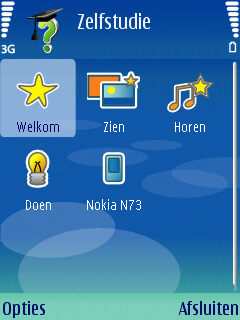 De zelfstudie applicatie is iets wat sindskort pas op de toestellen van Nokia aanwezig is. De applicatie legt alle functies uit van het toestel in een redelijk aantal aparte programma’s. Alle functies van het toestel komen aanbod en geven de gebruiker een goed beeld van het toestel. Standaard wordt dit programma bij de eerste keer opstarten opgeroepen waardoor iedereen gelijk door de complete uitleg kan lopen.