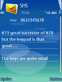 Het invoeren van de tekst via het toetsenbord gaat zoals al eerder gemeld niet lekker. Het toetsenbord is te vlak, de toetsen liggen te diep en zijn simpelweg te klein voor grotere vingers. Vele mensen hebben de N73 gebruikt en de meeste waren het erover eens dat snel een SMS bericht tikken op de N73 niet een fijne bezigheid zou zijn. Voor mensen die dus veel SMS berichten versturen is het wellicht een goed idee zelf eerst het toetsenbord te testen voordat men het toestel aanschaft.