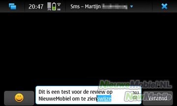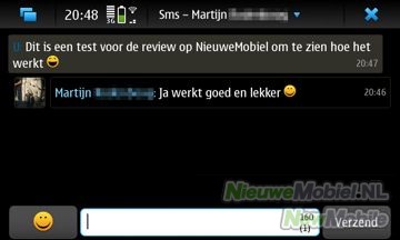 Een SMS’je of email versturen is zo eenvoudig als het kan zijn en met het fysieke QWERTY toetsenbord is het ook nog eens bijzonder fijn typen. Bij het verlaten van de teksteditor worden berichten opgeslagen als je ze wel hebt getypt maar nog niet hebt verzonden. Verder heeft de editor een teller die aftelt vanaf 160 tekens. De N900 heeft wel een woordenboek, maar werkt niet bijzonder goed. Het toestel geeft wel suggesties voor woorden terwijl je typt, maar dit is vaak niet het woord dat je zoekt. Dit komt voornamelijk doordat het toestel maar 1 suggestie geeft.