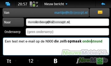 Gek genoeg is er geen ondersteuning voor MMS. Waarschijnlijk vond Nokia dit niet nodig aangezien emailen ook vlekkeloos gaat, maar voor sommige gebruikers kan dit toch een gemis zijn. Het instellen van een email account is niet echt lastig, maar gaat niet volledig automatisch. Zo kende de N900 niet de POP-instellingen van Hotmail (Live), maar Gmail was weer geen probleem. Ook met meerdere email accounts kan het toestel prima over weg.