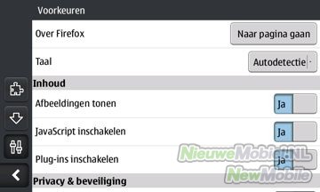 Firefox voor de PC heeft ‘tabbed’ browsen groot gemaakt en dit is ook mogelijk bij de mobiele variant. En dit doet de browser op een geheel eigen en vindingrijke manier. Door als het ware links buiten een webpagina te scrollen komt er een balk te voorschijn. Deze balk toont de websites die op dat moment geopend zijn in het zelfde venster. Door op het icoon onder in de balk te drukken open je een nieuwe, lege webpagina. Dit is handig gedaan en scheelt weer wat extra open vensters. Wanneer je naar rechts buiten de webpagina scrolt, komt er ook een balk te voorschijn. Hier zijn snelkoppelingen voor het aanmaken van bladwijzers, het bezoek van de vorige of volgende webpagina en de instellingen.