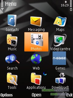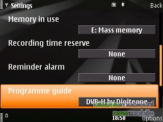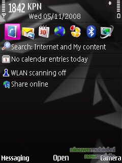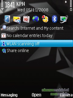 Het menu is het Symbian S60 menu, Feature Pack 2. Dat houdt in dat er in het stand-by menu standaard een aantal snelkoppelingen te vinden zijn. Horizontaal staan de meest gebruikte functies. Daaronder zijn er verticaal nog een aantal opties; search (internet en de telefoon zelf), afspraken, de WLAN scan en in dit geval share online. Dat betekent dus dat de gebruiker het grootste deel van de tijd niet eens in het hoofdmenu hoeft te komen. Maar hier bevind zich een van de grootste missers van het toestel. Er bestaat geen snelle link, naar het mobiele TV kijken. Wat ons betreft is dit echter wel een must, zeker na kennis te hebben gemaakt met de Samsung P960 die hier zelfs een hardwarematige knop voor gereserveerd had. De snelste manier om alsnog bij de TV te komen is via “de pukkel” naast de multidirectionale toets en dan op Live TV te klikken. Waarom dit niet onder het kopje “video centre” kon, die toch al in de snelstart balk staat is een raadsel. Verder levert “de pukkel” toegang tot een multimedia menu, waarin snelkoppelingen te vinden zijn naar, hoe kan het ook anders, multimedia zaken.