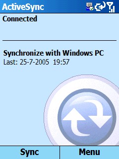 Voordat men kan synchroniseren moeten Microsoft ActiveSync en Microsoft Outlook geïnstalleerd zijn. Deze programma's, waarvan de laatste ook een prima e-mail programma is worden bij de verkoopversie meegeleverd op CD. Zijn beide programma's eenmaal geïnstalleerd dan gaat de rest bijna vanzelf. Synchroniseren met de PC gaat in een handomdraai en met dit programma zijn er ook andere Windows Mobile devices aan te sluiten, die naar keus hun data met de PC synchroniseren, of juist niet. Men kan dan eenvoudig een gastverbinding maken waarbij verder geen gegevens worden gesynchroniseerd, maar er wel data kan worden bekeken en over worden gezet op het toestel. De installatie van Microsoft Outlook is hier dus niet nodig – er wordt immers niets gesynchroniseerd. In beide gevallen, zowel met een permanente- als gastverbinding kan men de bestanden op het toestel bekijken via het ‘Mobiel Apparaat' icoon.