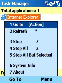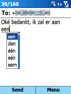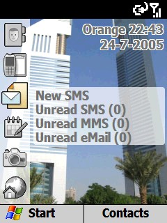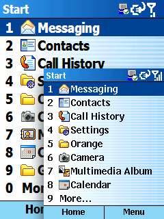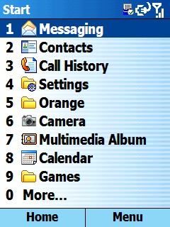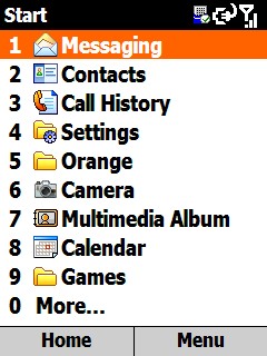 Natuurlijk is het homescreen niet het enigste. De aanwezige lijst met programma's, oftewel het programmamenu / Menu Start, wordt geopend door voor 'Start' te kiezen met de linkerfunctietoets. Dit doet al meteen vertrouwd aan voor de Windows-PC gebruiker. Er is vervolgens een lijst te zien met alle programma`s die op het toestel staan, bovenaan staan gewoonlijk 'Berichten', 'Contacten' , 'Kalender' en 'Internet Explorer'. Deze programma`s zijn standaard ook als quicklaunch iconen te vinden in het homescreen.