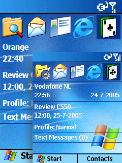 Dit is erg handig, zeker als men een bepaald programma vaak nodig heeft. Ook is er in het scherm te zien welke afspraken op dit moment zijn gepland, of opkomende afspraken of 'tasks' (taken). Ook is hier erg snel het profiel van het toestel aan te passen zoals besproken is. Net als de SPV C500 beschikt de C550 over het speciale Orange homescreen wat een stuk opgeruimder staat dan bij het standaard homescreen het geval is. Dit geheel zonder functionaliteit in te leveren.