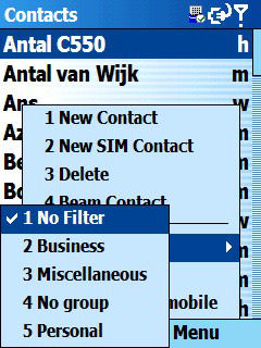 Het toestel heeft een erg uitgebreid en krachtig telefoonboek, direct benaderbaar vanuit het homescreen (contacten), wat handig te gebruiken is. Per contact kan enorm veel extra informatie worden ingevoerd. Niet alleen standaardnaam, telefoonnummer en volledige adresgegevens maar ook fax, autotelefoon, radiotelefoon, assistent telefoon, drie verschillende e-mail adressen, website, werkgegevens en eventuele anders adresgegevens behoren tot de mogelijkheden. Daarnaast is er ook nog ruimte om een eigen beltoon in te stellen en/of notities voor de contactpersoon toe te voegen. Alle genoemde gegevens zijn ook met Outlook te synchroniseren. Een completer en makkelijker te gebruiken telefoonboek zal men niet erg snel aantreffen op deze manier.