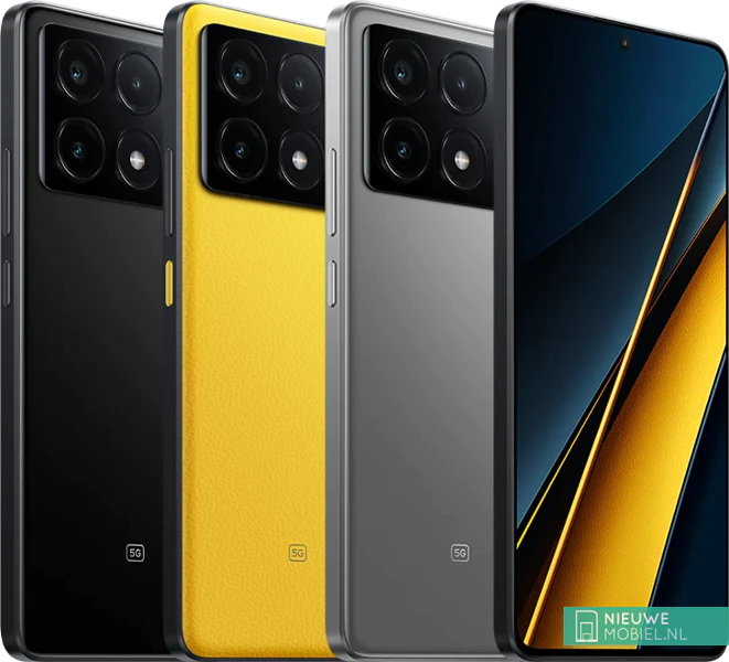 De POCO X6 Pro is een snelle 5G-smartphone. Hiervoor verantwoordelijk is de krachtige Dimensity 8300-Ultra chip, het vloeiende 120Hz scherm en de 67W snel op te laden batterij. De gele X6 Pro valt extra op door z'n Faux Leather achterkant, of je gaat voor onopvallend zwart of grijs. Welke kleur je ook kiest; ze zijn allemaal IP54 waterdicht.
