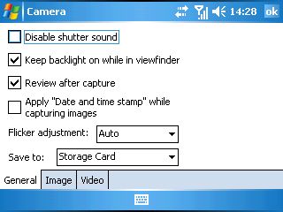 In het toestel vindt men een redelijk aantal instellingen. Onder andere diverse instellingen voor het omgevingslicht (Auto, Daglicht, Gloeilamp, Fluorescerend, Nacht), vier effecten (Grijstint, Sepia, Negatief en Koel, wat een soort blauwtint is) en de keuze uit Superfijn, Fijn, Normaal en Standaard als kwaliteitsopties. Foto's kunnen daarnaast in de resoluties 1600 x 1200, 1280 x 1024, 640 x 480, 320 x 240 en 160 x 120 pixels worden geschoten. Andere opties zijn het toevoegen van een datum en tijd in de foto, de keuze voor de naam van de foto, het uitschakelen van het camerageluid, het inschakelen van een zelfontspanner, het wijzigen van de trillingsaanpassing en het opslagmedium. Zoomen is alleen mogelijk in lagere resoluties, zoals bij 640 x 480 pixels tot 2x zoom.