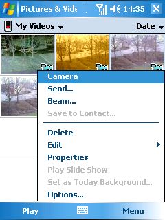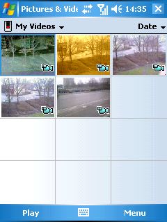 De video's kunnen in hetzelfde album geopend worden. Het is mogelijk de video's over het volledige scherm te bekijken of om deze te verzenden via Bluetooth, infrarood, E-mail of MMS-bericht.