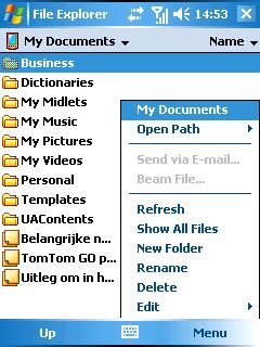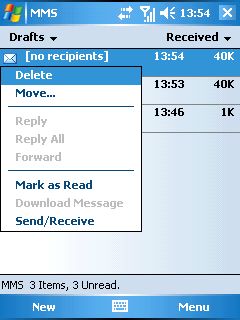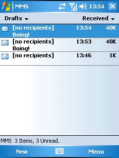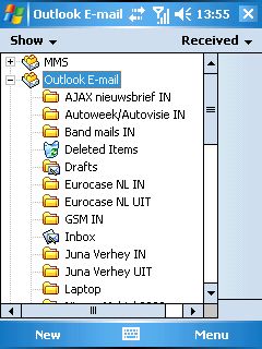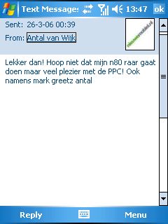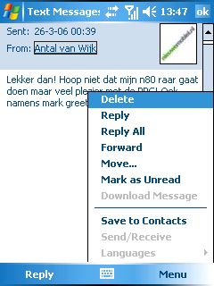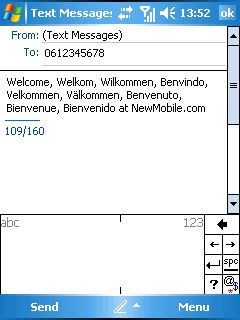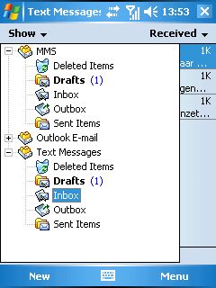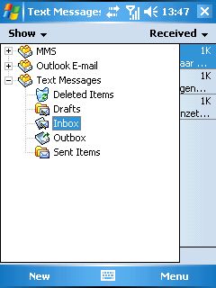 Natuurlijk is er de standaard SMS mogelijkheid welke overigens weer geïntegreerd is met de Outlook versie van Windows Mobile. In deze Outlook versie is namelijk naast het gebruikelijke E-mail account (zoals deze te vinden is in de desktop versie van Outlook) ook een map 'Tekstberichten' te vinden alwaar de SMS berichten opgeslagen en beheerd kunnen worden. Ook is er een map 'MMS' te vinden waarvandaan MMS berichten verstuurd kunnen worden. In principe gaat SMS-en op dezelfde manier als bijvoorbeeld een E-mail opmaken en versturen. Afhankelijk van uit welke map geopereerd wordt kan dus op dezelfde manier een E-mail, een SMS-bericht óf een MMS-bericht verstuurd worden.
