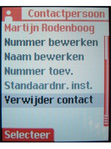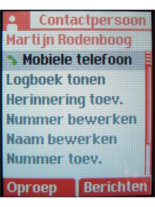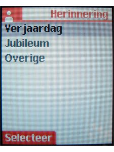 Het is mogelijk een herinnering op te slaan per persoon, die bestaan uit de opties verjaardag, jubileum en overige. Verder kan de contactpersoon verwijderd worden en kunnen nieuwe nummers toegevoegd worden. Ook hier was het beter geweest de tekst van links naar rechts te laten scrollen en geen rare afkortingen te gebruiken.