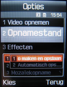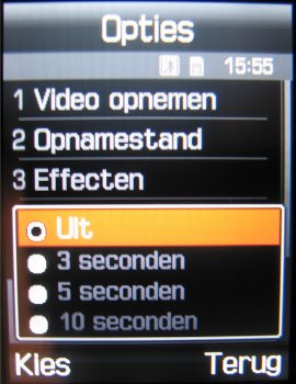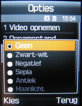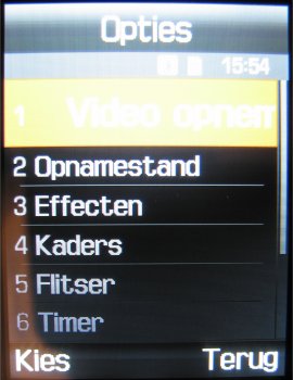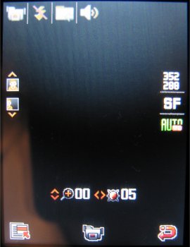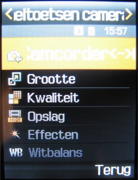 Naast deze instellingen is het mogelijk tijdens de video in te zoomen, de helderheid in zeven stappen in te stellen, de video horizontaal of verticaal om te flippen en de flitser te gebruiken. Verder zijn er in totaal zeven effecten, namelijk: Zwart/wit, Negatief, Sepia, Reliëf, Antiek, Maanlicht en Mist. Als laatste is er in de videocamera functie een zelfontspanner (keuze uit: Uit, 3 seconden, 5 seconden, 10 seconden).