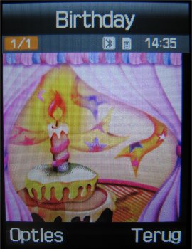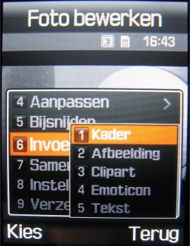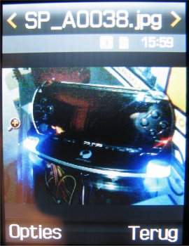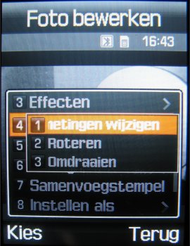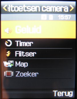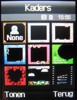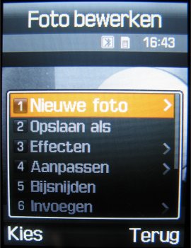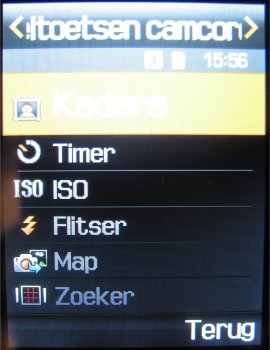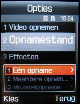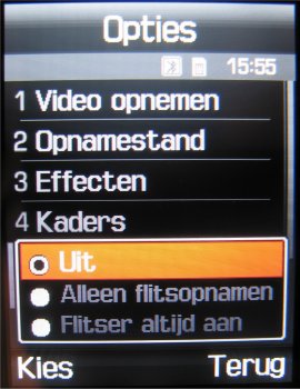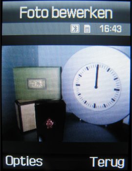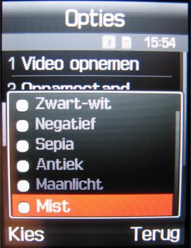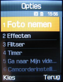 Naast deze instellingen is het mogelijk om uit drie fotostanden te kiezen, namelijk: Eén opname, Multishot (keuze uit: 6 foto’s kwaliteit normaal, 6 foto’s kwaliteit hoog, 9 foto’s kwaliteit normaal, 9 foto’s kwaliteit hoog, 15 foto’s kwaliteit normaal of 15 foto’s kwaliteit hoog) en Mozaïek opname. Naast deze opties kan men tijdens het maken van een foto inzoomen, de helderheid in zeven stappen instellen, de foto horizontaal en verticaal omflippen en de flitser gebruiken. Verder zijn er in totaal zeven effecten, namelijk: Zwart/wit, negatief, Sepia, Reliëf, Antiek, Maanlicht en Mist. Als laatste zijn er in de camera functie een zelfontspanner (keuze uit: Uit, 3 seconden, 5 seconden, 10 seconden) en mogelijkheid tot het toevoegen van één van de 30 kaders toegevoegd. Helaas kan men niet alle opties gebruiken bij alle resoluties. Zoomen gaat gelukkig wel bij alle resoluties, alleen worden kaders gebruikt bij een resolutie van 240 x 216 pixels.