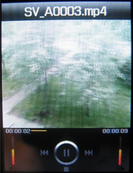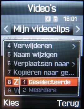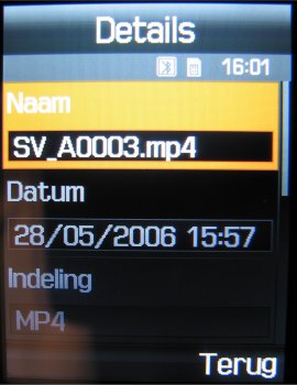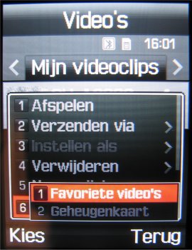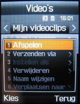 Voor videobestanden geldt bijna hetzelfde. Deze bestanden worden opgeslagen in het MP4 en 3GP formaat en in het videogedeelte van het bestandsbeheer. Daar kan men de video bekijken, hernoemen, wissen, een wisbeveiliging geven of gewoon de afbeelding versturen via MMS, Email of Bluetooth. De grote resoluties gebruiken MP4 en de Video MMS functie 3GP. Door de 1 toets in te drukken kan men de video’s op het volledige scherm bekijken.