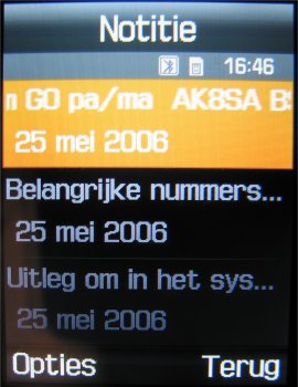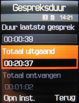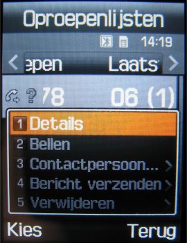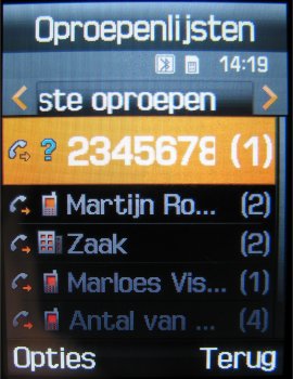 Heeft men na een gesprek de behoefte de gesprekkenlijst te raadplegen dan kan dat via het menu of via de opneemtoets. Via beide opties komt men in het menuonderdeel oproepenlijst. Door de 5-richtings bedieningstoets in vier richtingen te bewegen kan men door het hele menu alle informatie opvragen. Kiest men een oproep dan krijgt men een overzicht van de naam en het nummer van de persoon te zien en daarnaast de datum en tijd van het gesprek. Helaas geen duur van het gesprek. De duur van het gesprek kan alleen opgevraagd worden via de menuoptie, waar ook alleen de tellers gewist kunnen worden.