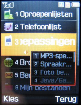 Het vierde en laatste onderdeel bevat het grootste aantal programma’s. Dit is namelijk de Toepassingen. Dit onderdeel van het menu bevat de JAVA/Games, MP3 speler, Spraakrecorder, Afbeeldingen editor, Wereldtijd, Alarm, Calculator, Converter, Timer, Stopwatch, Sleutelbeheer, Notitie en het provider onderdeel Vodafone. Elk onderdeel zal hieronder kort uitgewerkt worden op één onderdeel na, namelijk de JAVA/Games. Dit onderdeel bevat alleen games en deze zullen op de volgende pagina bespoken worden onder het punt games.