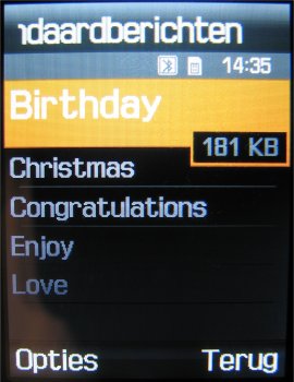 In totaal zijn er vijf standaard MMS berichten meegeleverd, die geanimeerd zijn en direct na het toevoegen van een leuke tekst verstuurd kunnen worden. Men kan deze berichten zelf ook nog aanpassen voor een eigen tintje. Maar standaard SMS berichten is men blijkbaar vergeten, want deze map is compleet leeg.