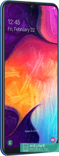Samsung heeft de Galaxy A50 uitgerust met een behoorlijk groot kleurrijk scherm. Qua omvang meet hij 6,4 inch maar dankzij de dunne randen is de behuizing niet overdreven groot. Het paneel is een zogenaamd Super AMOLED wat garant staat voor een groot contrast met diepe zwarttinten en goede afleesbaarheid buiten. Bovenin zit een kleine inkeping voor de 20 megapixel selfiecamera die daarnaast is uitgerust met Selfie Focus. Daarmee schiet je selfies met wazige achtergrond. Het scherm kent verder nog een geïntegreerde vingerafdrukscanner. Die zit dus niet meer achterop of in de zijkant. Let voor je een screenprotector wel even op of deze daar mee overweg kan. De vingerafdrukscanner werkt namelijk met ultrasoon geluid en sommige screenprotectors laten dat niet goed door.