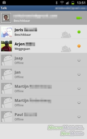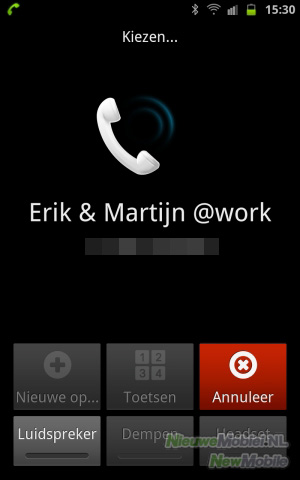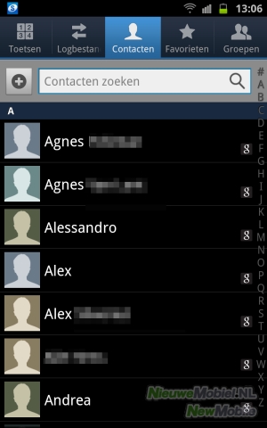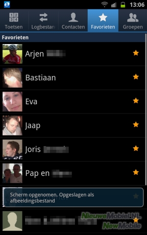 De telefoon-, contacten-, en logboek-applicatie zijn in één menu samengevoegd. Door middel van tabbladen kun je bladeren tussen de verschillende submenu's. Er zijn ook tabbladen voor 'favorieten' en 'groepen'.