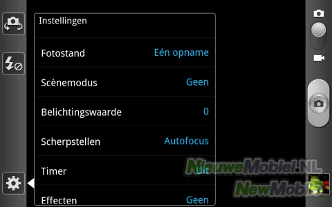 Wanneer we de instellingentoets raadplegen vinden we alle camera-opties. We zetten ze even op een rij: zelfportret, flitser, fotostand (één opname, smile shot, beauty-shot, panorama, opname delen, actiefoto en cartoon), scènemodi (geen, portret, landschap, nacht, sport, feest/binnen, strand/sneeuw/zonsondergang, dageraad, herfstkleur, vuurwerk, tekst, kaarslicht en verlichting), belichtingswaarde, scherpstellen (autofocus, macro en gezicht detecteren), timer, effecten (geen, negatief, grijstinten en sepia), resolutie (verschillende mogelijkheden tot en met 8 MP), witbalans, ISO-waarde, meting, zichtbaarheid buiten, anti-trillen, automatisch contrast, knipperdetectie, richtlijnen, beeldkwaliteit en GPS-tag. Erg veel instellingen dus, waarbij je je kunt afvragen in hoeverre dit echt nut heeft.