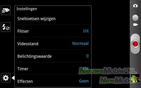 In het camerascherm zijn standaard sneltoetsen aanwezig naar de secundaire camera, de flitsinstellingen (aan, uit, automatisch), de videocamera en de galerij. Welke en hoeveel (max. 5) sneltoetsen er worden weergegeven kun je zelf aanpassen en inrichten.