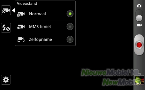 Voor de secundaire camera zijn iets minder opties aanwezig, net als voor de video-camera. De opties voor video zijn: flitser (aan/uit), videostand (normaal, limiet voor MMS of zelfopname), belichtingswaarde, timer, effecten (zelfde als in camerastand), resolutie (tot en met 1080p), witbalans, zichtbaarheid buiten, videokwaliteit, richtlijnen, opslag en resetten.