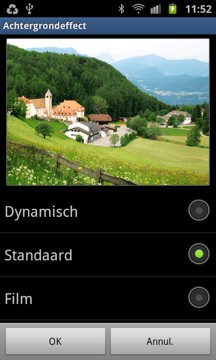 De camera-interface is gelukkig niet de standaard Android-interface. De knoppen zijn goed gepositioneerd en instellingen zijn zelfs als sneltoets in te stellen voor nog sneller gebruik. In de cameramodus is de maximaal te kiezen resolutie 3264 x 2448 pixels terwijl ook nog voor 6.5, 3.2, 2.4, 0.4 en 0.3 megapixel gekozen kan worden. Overige instellingen zijn; zelfportret, flitser (automatisch, uit, aan), fotostand (één, smile-shot, beautyshot, panorama, actie en cartoon), scénemodus (geen, portret, landschap, nacht, sport, feest/binnen, strand/sneeuw, zonsondergang, dageraad, herfstkleur, vuurwerk, tekst, candlelight en achtergrond verlichting), belichtingswaarde, scherpstellen (autofocus, macro en gezicht detecteren), timer (uit, 2 sec., 5 sec. en 10 sec), effecten (geen, negatief, grijstinten en sepia), witbalans (automatisch, daglicht, bewolkt, kunstlicht, TL-verlichting, ISO (automatisch, 100, 200, 400 en 800), meting (nadruk centrum, spotmeting en matrix), zichtbaarheid buiten, anti-trillen, automatisch contrast, knipperdetectie, richtlijnen, overzicht, beeldkwaliteit (superhoog, fijn en normaal), GPS-tag en opslag. Erg veel dus waarvan de meeste slechts gimmicks zijn.