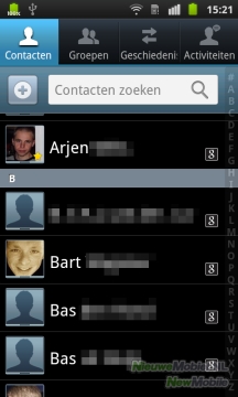 Samsung heeft niet alleen het uiterlijk van de homescreen aangepakt. Ook een groot aantal standaardtoepassingen zijn van een nieuwe uiterlijk en extra functies voorzien. Een daarvan is de contacten app. Die is iets is iets uitgebreider dan het standaard telefoonboek van Android. Bovenin staan vier tabbladen. De eerste is voor een alfabetische lijst met contactpersonen. Ook voor integratie met sociale media is gezorgd. De Galaxy S Plus biedt de mogelijkheid om contacten van Facebook en Twitter te importeren, terwijl je contacten uiteraard ook met je Google-account worden gesynchroniseerd.