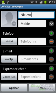 Voor een nieuw contact kunnen standaard voor- en achternaam, telefoonnummer, e-mail, chatadres, groepen, beltoon, bedrijf en functie ingevoerd worden. Wil je extra velden, dan kun je die eenvoudig toevoegen.